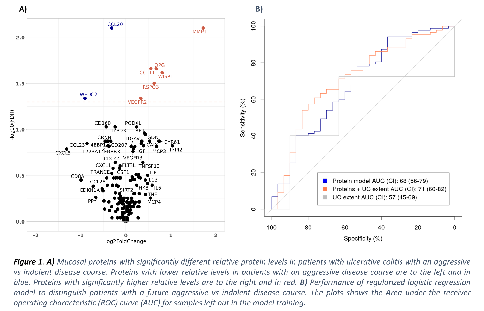 117 patients provided a macroscopically inflamed colonic/rectal biopsy at diagnosis of UC. Basic demographics and clinical characteristics are presented in Table 1. Relative protein levels of WFDC2 and CCL20 were significantly lower in lysates from patients developing an aggressive course vs patients developing an indolent course, while estimates of MMP-1, CCL11, WISP1, OPG, RSPO3 and VEGFR2 were higher (Figure 1A). Regularized logistic regression identified signatures restricted to 28 proteins, distinguishing aggressive from indolent UC courses, yielding an AUC of 0.68 (95% confidence interval (CI): 0.56-0.79) for left-out samples (Figure 1B). Incorporating extent of inflammation at diagnosis in the model improved the AUC to 0.71 (95% CI: 0.60-0.82).