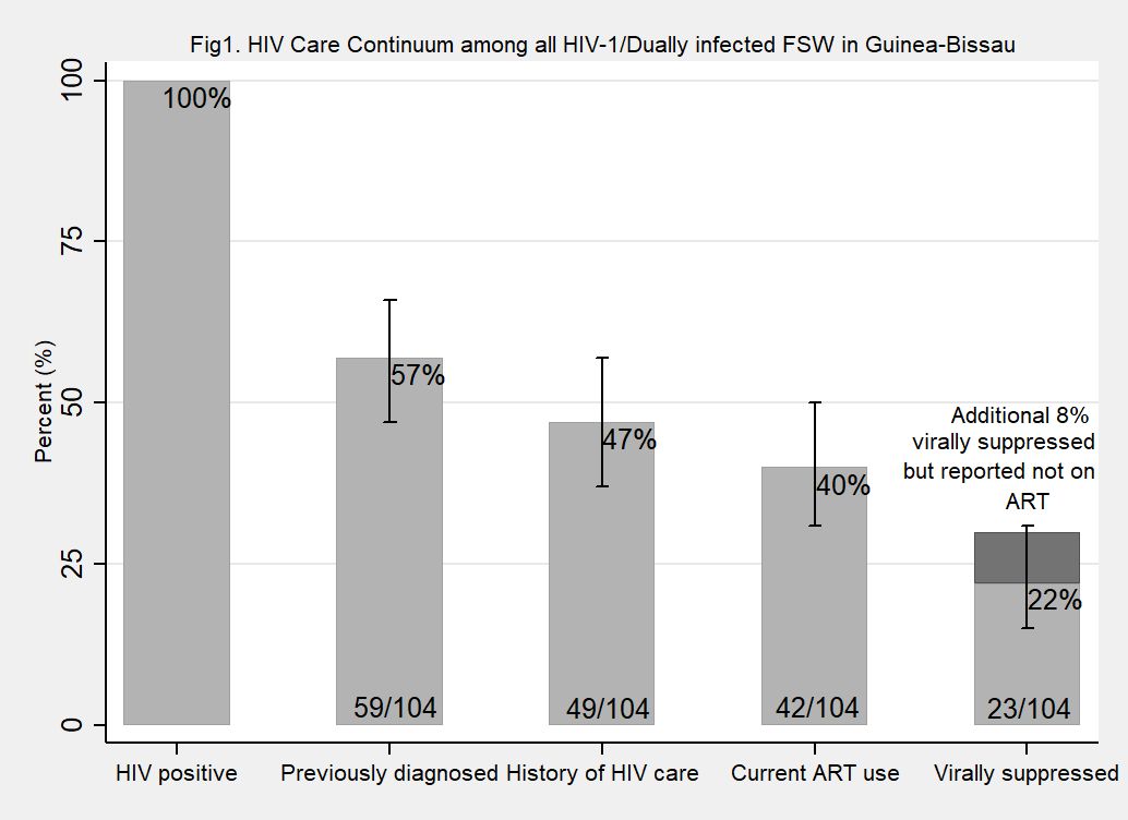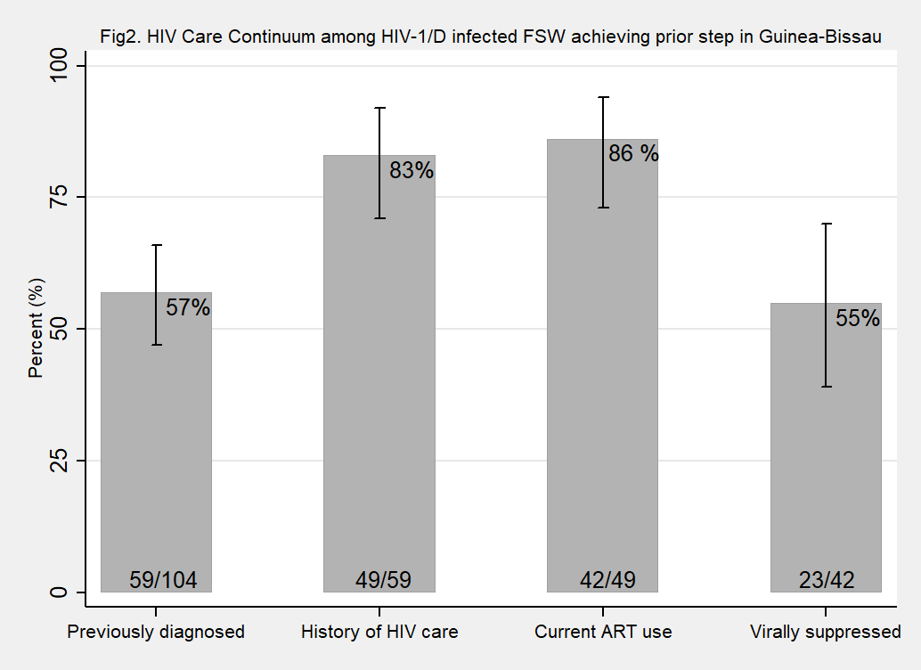 In collaboration with ENDA Santé, we used venue based sampling to enroll FSW in 8 cities in Guinea-Bissau from October 2014 to September 2017. Blood samples were drawn and screened on-site with HIV rapid testing. Participants completed a survey that included demographic factors, sexual risk behavior and treatment status. CD4 counts, HIV type discrimination and viral load was performed. Proportions and 95 % confidence intervals were computed for the four continuum outcomes; previous diagnosis, history of HIV care, current ART use and viral suppression (<1000 copies/ml). These continuum outcomes was estimated by two different approaches; using all HIV-1/Dually infected FSW as the denominator and by using HIV-1/Dually infected FSW achieving the prior step in the continuum as the denominator. Poisson regression was used to investigate the associations of demographics and transmission risk behavior with each continuum outcome.